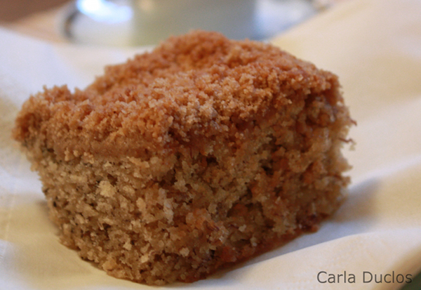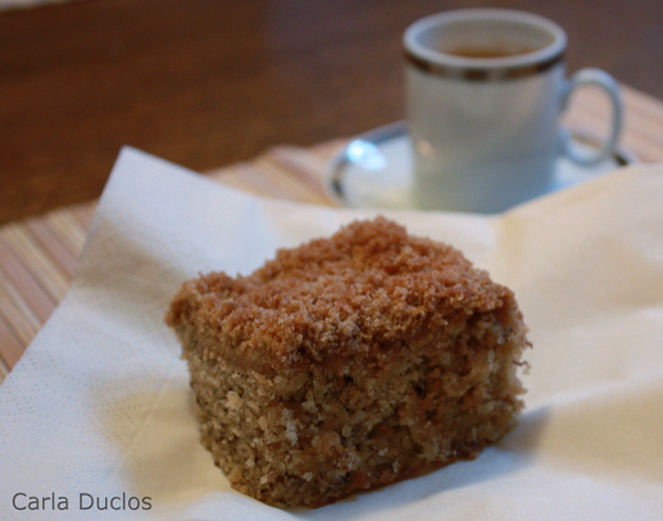 Delicioso bolo de banana com farofa doce de cobertura. O bolo é úmido, leve e com sabor de banana na medida certa. Perfeito para comer acompanhado de um cafezinho.